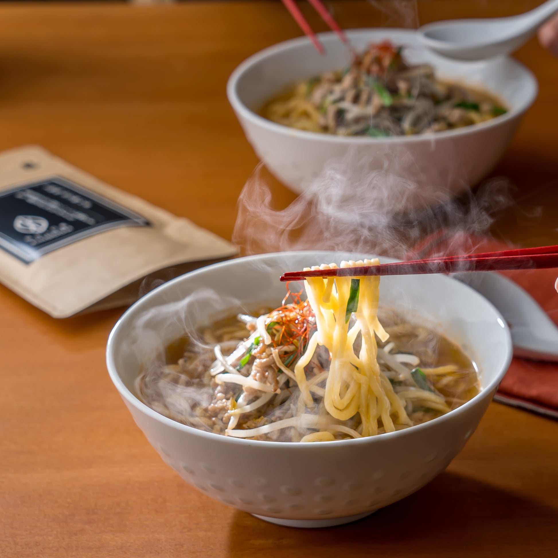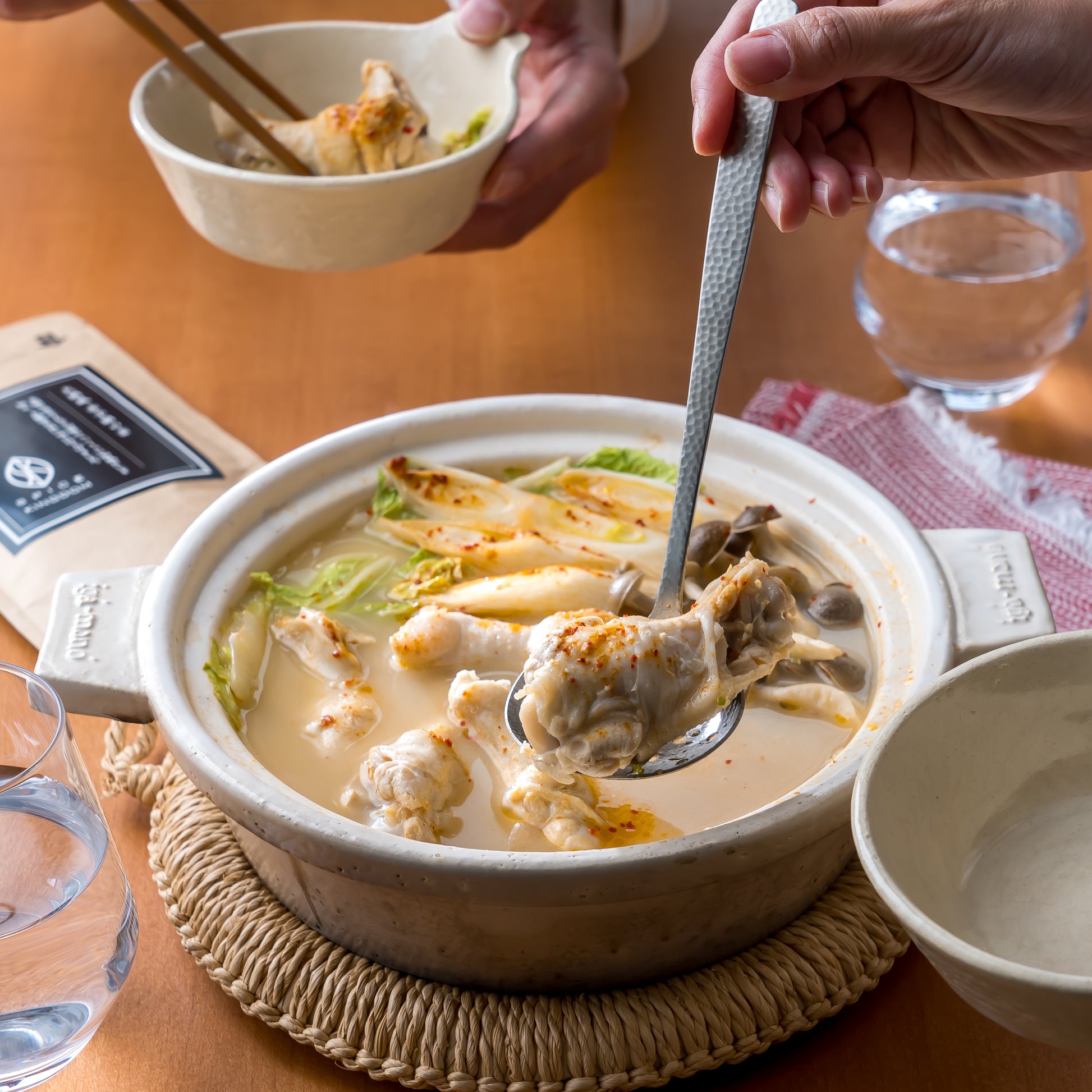 辛味のある鍋スープとしてだけではなく、水炊き鍋などのスープの味変にもお使いいただけます。縮れ麺にも合いますので鍋のシメにもおすすめです。